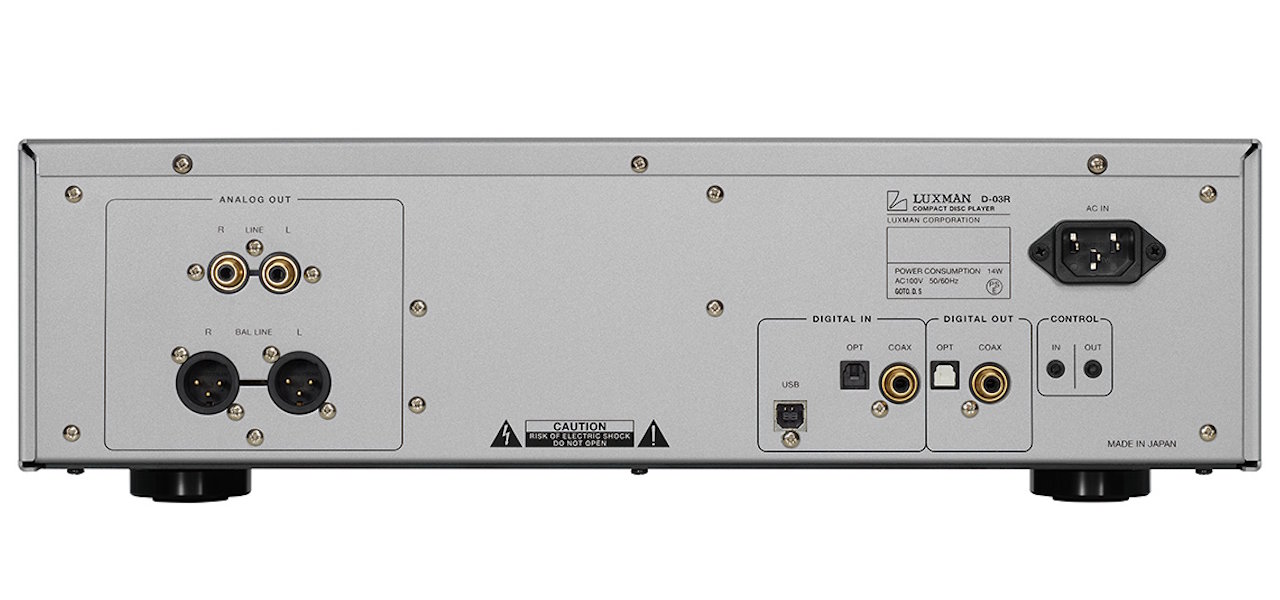 Le circuit analogique se démarque par un circuit tampon symétrique à quatre unités d’amplification, ainsi que par une alimentation plus puissante, le DAC étant filtrée par des condensateurs d’une puissance doublée de 3 300 µF à 6 600 µF. Des bornes RCA plaquées or d’un pas de 18 mm et des borniers XLR Neutrik permettent de connecter le lecteur CD (il faut monter au D-07X pour lire les SACD) vers un préamplificateur. Conçu sur un nouveau châssis, avec une mécanique revue sur une plaque d’acier de 3.2 mm pour mieux bloquer les vibrations, le D-03R est livré avec une nouvelle télécommande RD-28, qui garde le pavé numérique pour sélectionner plus facilement les pistes en lecture CD.